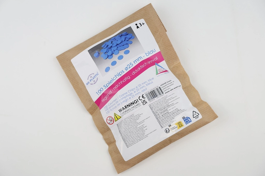 Las fichas están fabricadas en Alemania y envasadas en una bolsa de papel con cierre reutilizable y certificación FSC, lo que garantiza un enfoque responsable hacia la naturaleza. Con un diámetro de 2,5 cm, son fáciles de agarrar incluso para los más pequeños.