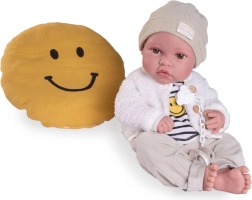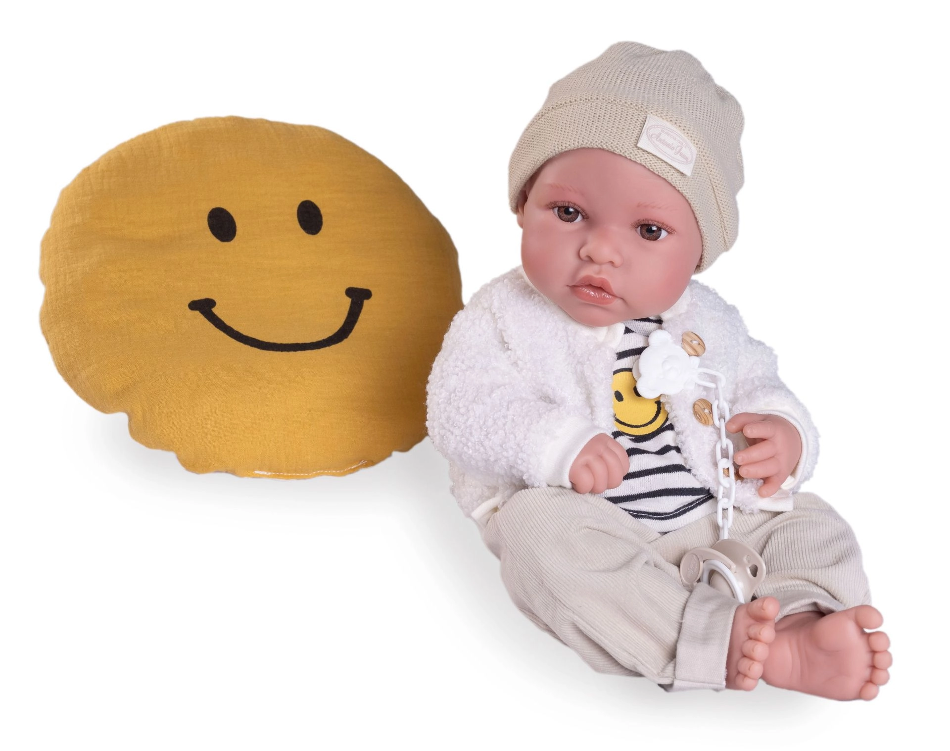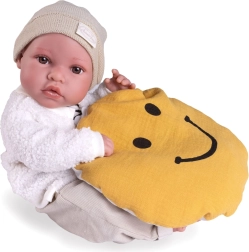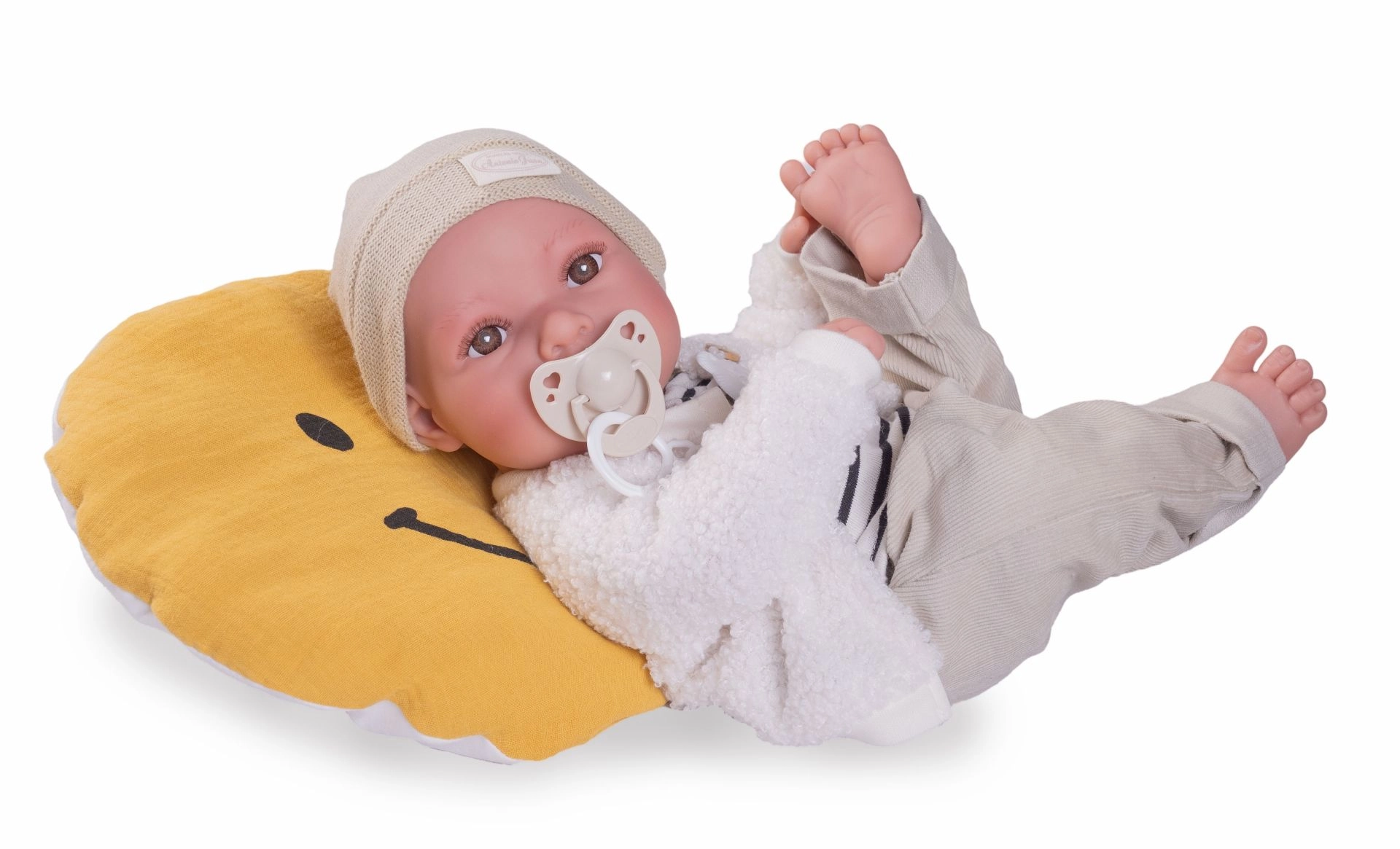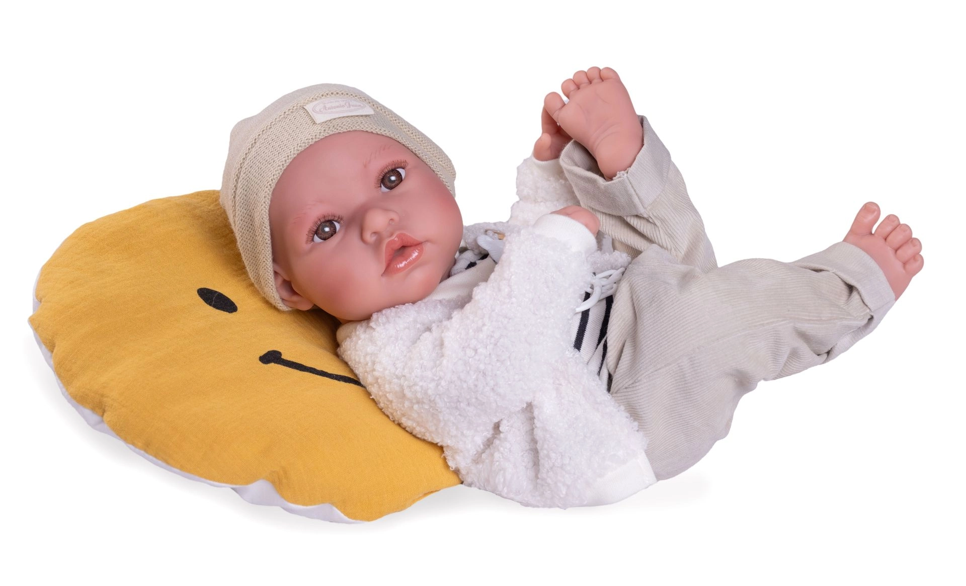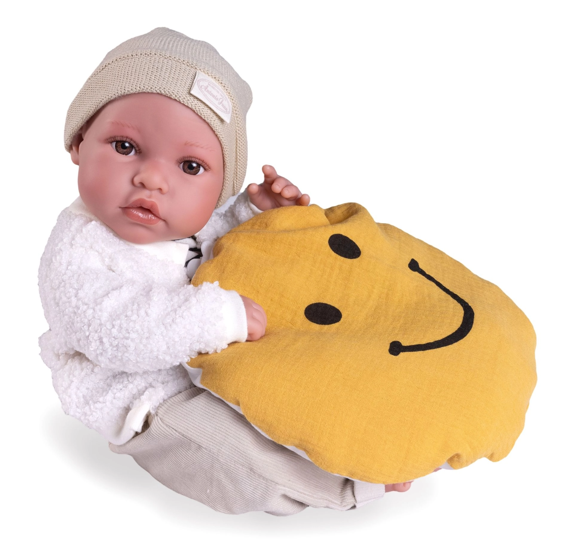 Esta muñeca española está fabricada en vinilo especial suavizado, agradable al tacto y que proporciona a la figura un aspecto realista, incluidos varios tipos de pliegues y detalles, incluyendo los genitales. Gracias a ello, los niños pueden vivir momentos únicos cuidando de su propio “recién nacido”.
