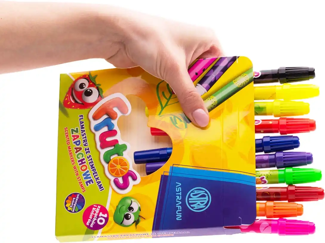 Los rotuladores aromáticos ASTRA Frutos convierten cada dibujo en un divertido juego sensorial. Cada tono tiene su propio y agradable aroma frutal, que impulsa la creatividad infantil y hace más ameno el tiempo de pintar, colorear y decorar. El diseño de doble punta combina la punta redonda clásica para trazos fluidos y la punta con sello para motivos decorativos rápidos.