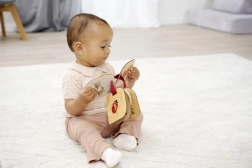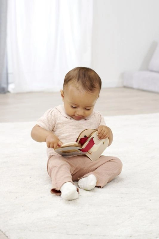 El práctico anillo de fijación permite llevar el libro con seguridad de viaje y sujetarlo al cochecito o a la silla de coche. Está fabricado en 100% madera de tilo con certificación FSC, por lo que cumple los requisitos de un juguete de calidad y sostenible para los más pequeños a partir de 12 meses.
