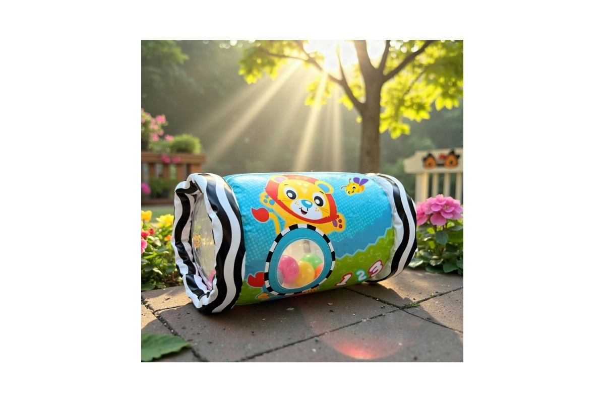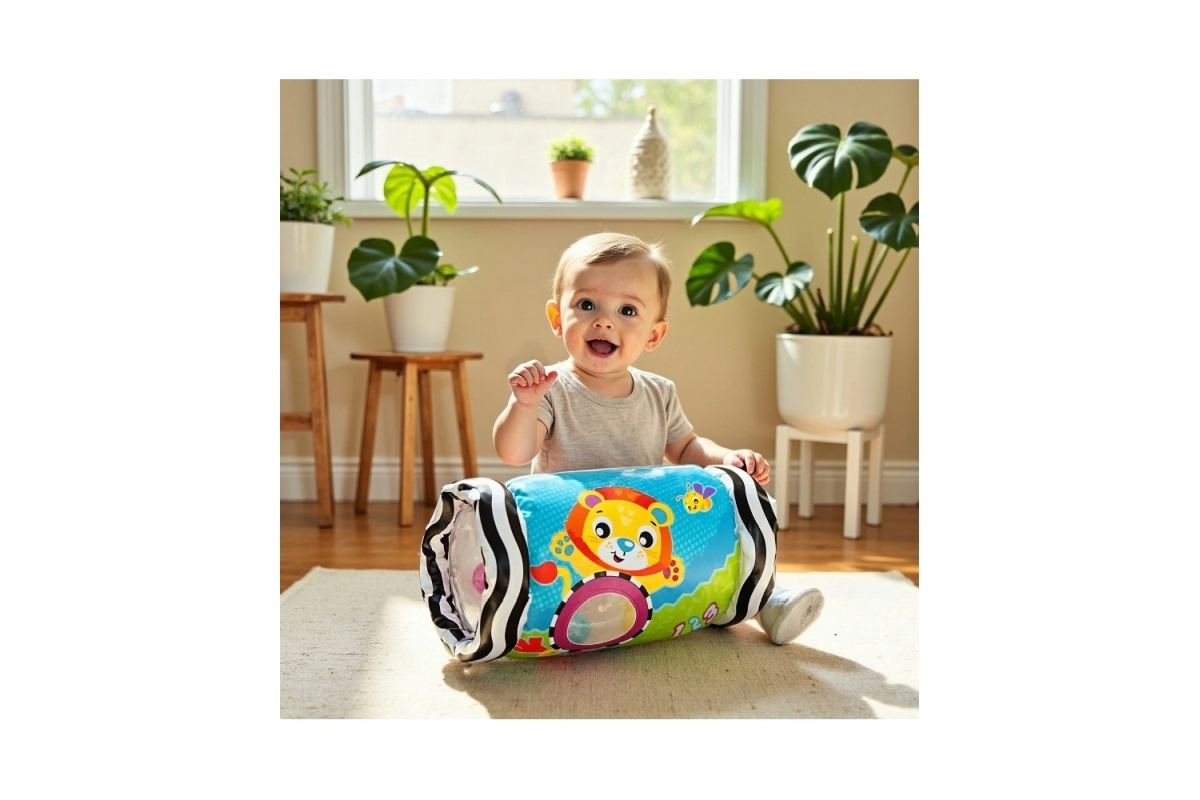La forma cilíndrica rueda con facilidad, anima al bebé a estirarse, darse la vuelta y gatear, desarrollando así la motricidad gruesa y la coordinación.