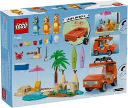 ¡Ponte en marcha con BLUEY para un día soleado en la playa! El set incluye el icónico coche familiar con espacio en el techo para dos tablas de surf, compartimento trasero para la nevera portátil y techo abatible para acceder fácilmente al interior. No falta una encantadora escena playera: gran castillo de arena, palmera, tumbona, sombrilla e incluso una cola marina de arena que puede colocarse a una minifigura.