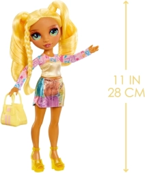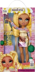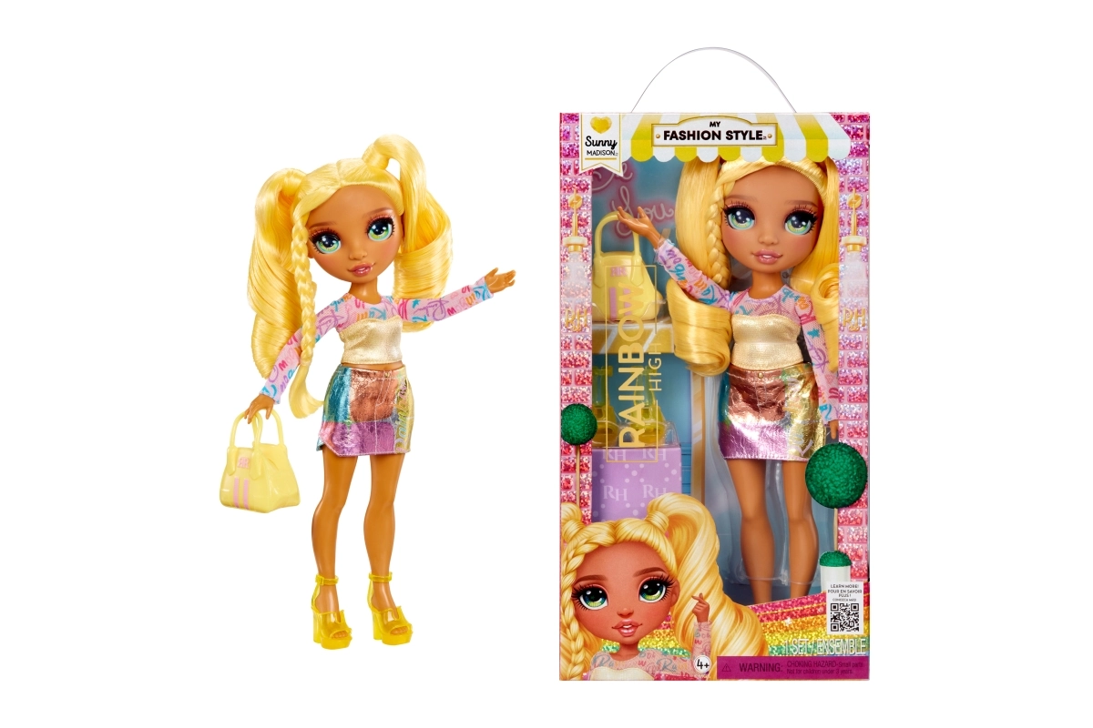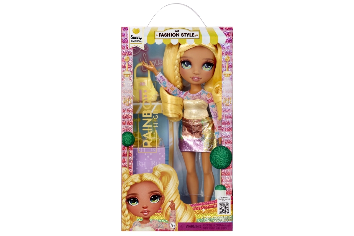 Conoce a la muñeca Sunny de la colección Rainbow High Fashion Style: un icono de estilo que brilla de la cabeza a los pies. Tiene cabello largo amarillo fácil de peinar, ojos de cristal detallados y pestañas delicadas. Incluye prendas de outfit a la moda, zapatos a juego y bolso. Gracias a sus articulaciones para un posado sencillo, es ideal para peinados, juego de historias y colección. Edad 3+.