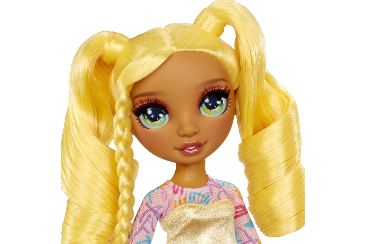 Sunny de RAINBOW HIGH es una musa de la moda segura de sí misma que inspira a los niños a expresar su propia individualidad. Su conjunto mezcla acentos amarillo brillante y arcoíris: top llamativo, falda atemporal, elegantes zapatos de tacón y bolso a tono. Su cabello recogido en divertidas trenzas invita a la creatividad al peinar.
