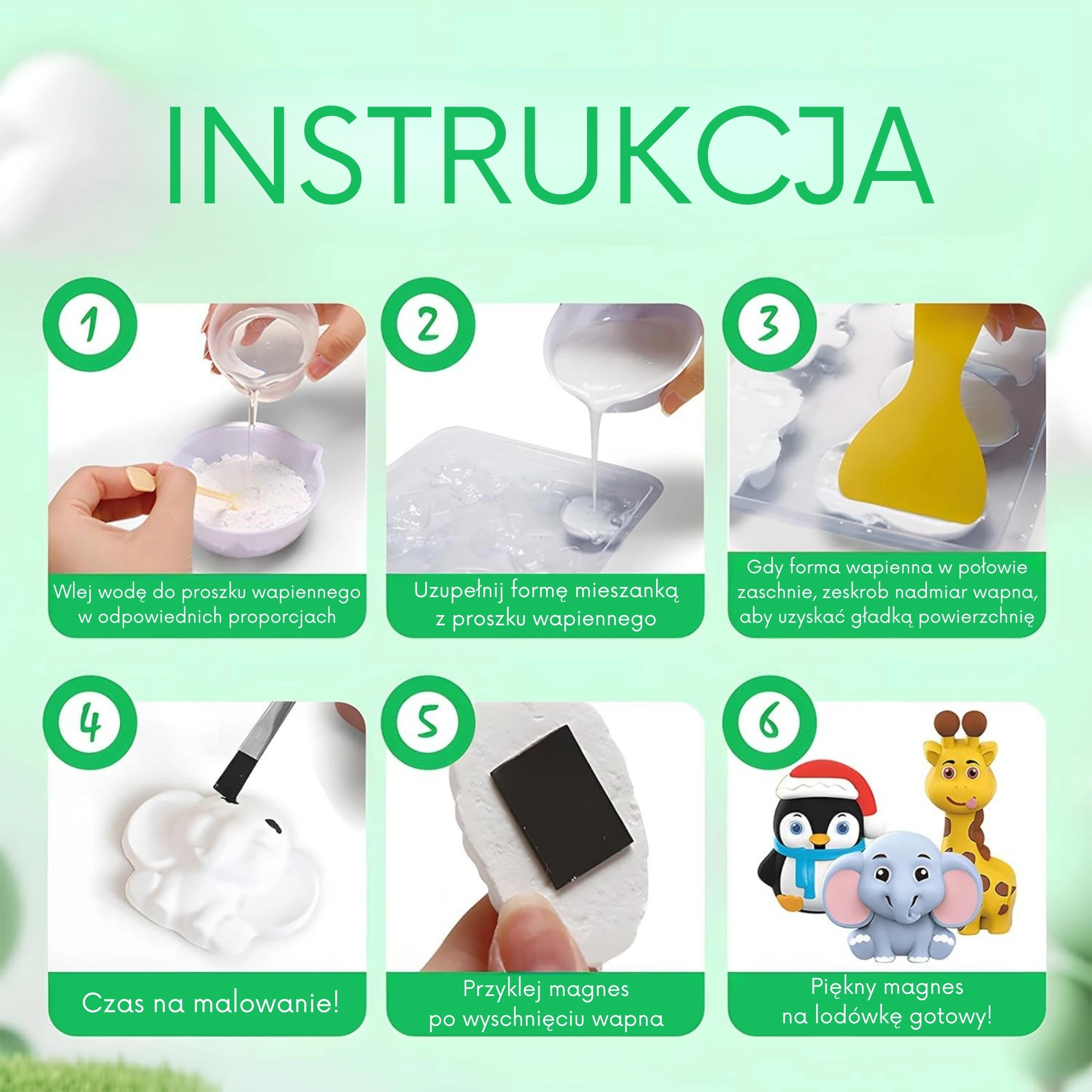 Este ingenioso set 2 en 1 combina el moldeado y la pintura de figuras en una sola actividad creativa. Los niños preparan el yeso, lo vierten en el molde y, tras el secado, lo colorean con tonos vivos. Así nacen decoraciones únicas para la habitación o regalos originales para sus seres queridos.