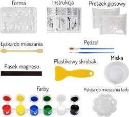 - Todo incluido en el paquete: moldes, yeso, cuenco, cucharita, paleta, 6 pinturas, pincel, espátula, instrucciones