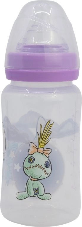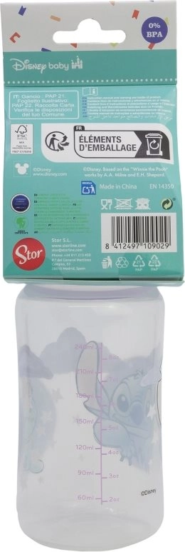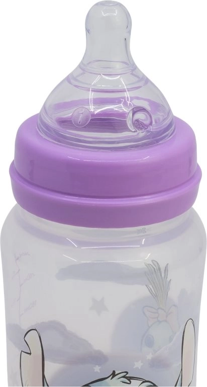 Práctico biberón anticólicos con motivo de Lilo y Stitch para una alimentación cómoda de los recién nacidos. Ofrece capacidad de 240 ml, tetina de silicona para una succión natural e sistema integrado anticólicos que reduce el riesgo de molestias. Es libre de BPA y cumple la norma EN 14350.
