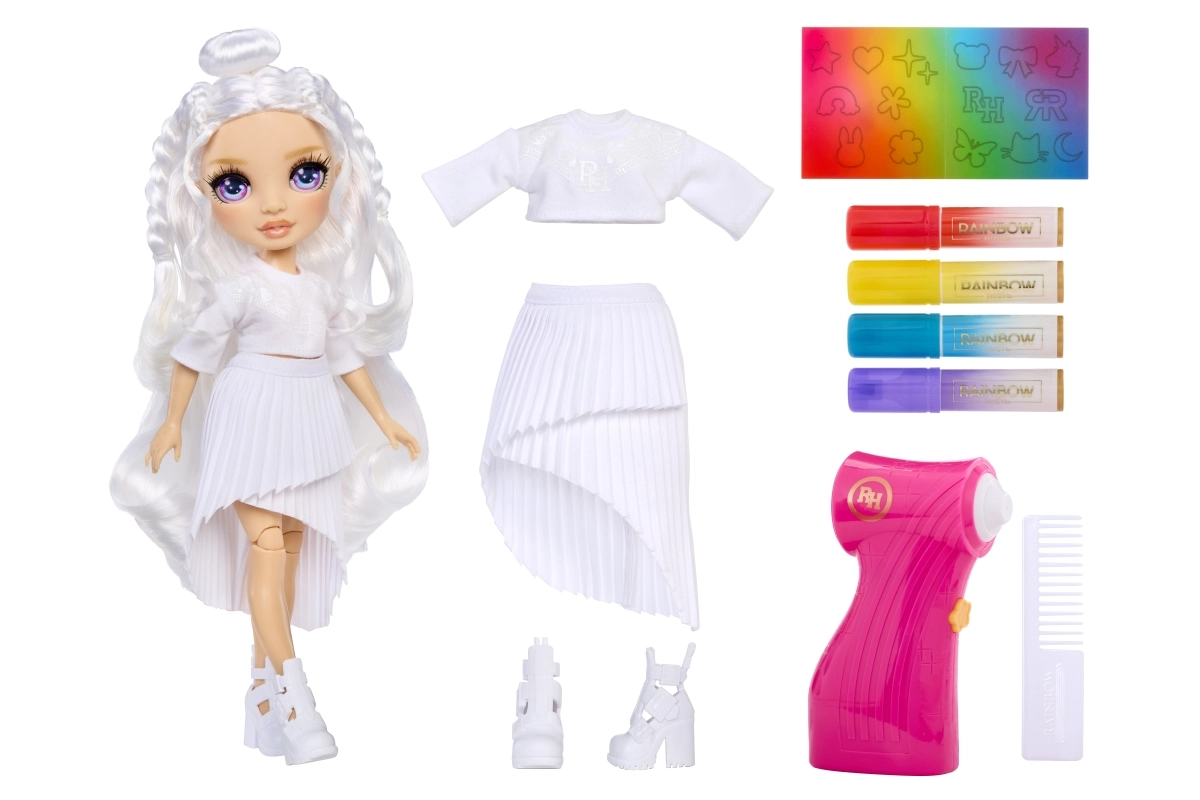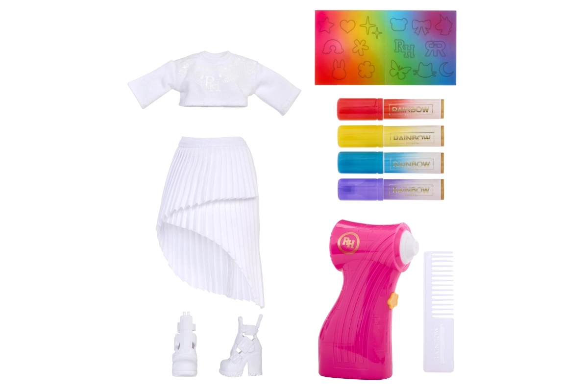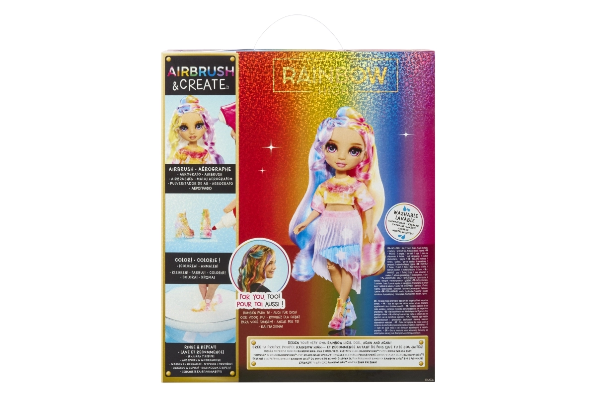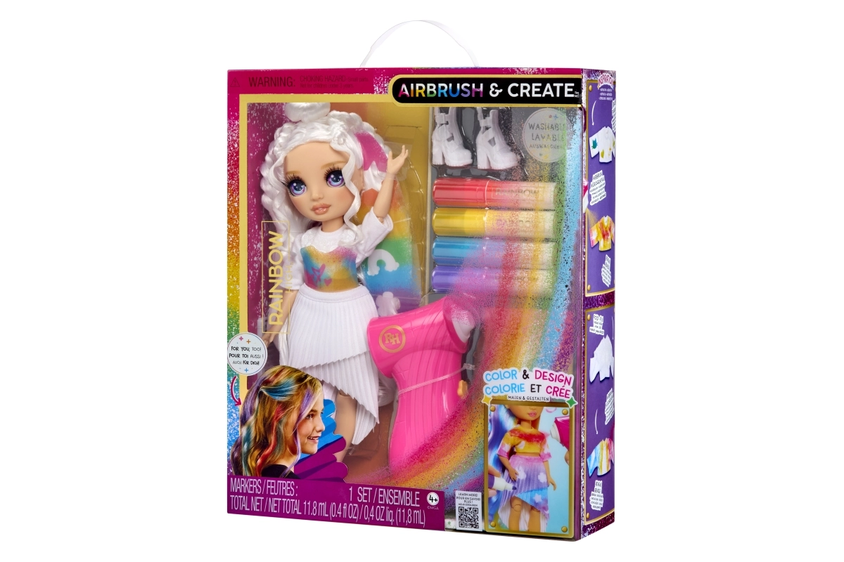 La muñeca Rainbow High Airbrush & Create es como un lienzo en blanco para pequeños diseñadores. Con los rotuladores lavables incluidos y el aplicador de aire, crearás fácilmente un look original: desde suaves degradados hasta patrones llamativos. El diseño final se puede lavar en cualquier momento y empezar de nuevo.