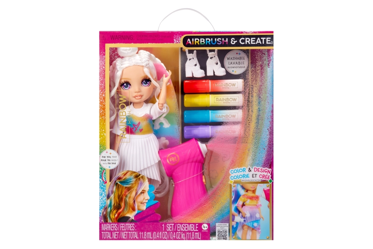 Descubre un mundo de creatividad con la muñeca Rainbow High Airbrush & Create. Este set único permite a los niños diseñar el estilo de la muñeca con rotuladores lavables y una herramienta de “airbrush”. La muñeca es totalmente blanca y está lista para tus ideas: colorea su pelo, ropa y zapatos. Gracias a la tinta lavable, puedes crear una y otra vez, desarrollar la imaginación y disfrutar de un juego creativo sin desorden.