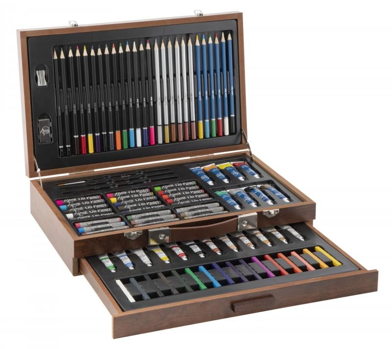 Descubra un set artístico universal en un elegante maletín de madera que ofrece todo para dibujar y pintar. La estructura sólida, la tapa con cierre y los robustos pestillos garantizan un almacenamiento seguro y un transporte sencillo. En el paquete encontrará una amplia gama de colores, lápices, tizas y pinceles para infinitas horas de creación. Ideal para principiantes y avanzados.