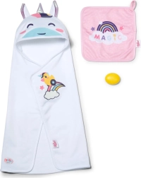 Este mágico set de toallas BABY born ofrece todo lo necesario para divertidos rituales de baño. Dos toallas con motivos de arcoíris y unicornio encantarán a cualquier pequeño cuidador, mientras que la capucha con cuerno arcoíris y tiernas orejitas aporta un toque alegre a cada secado.