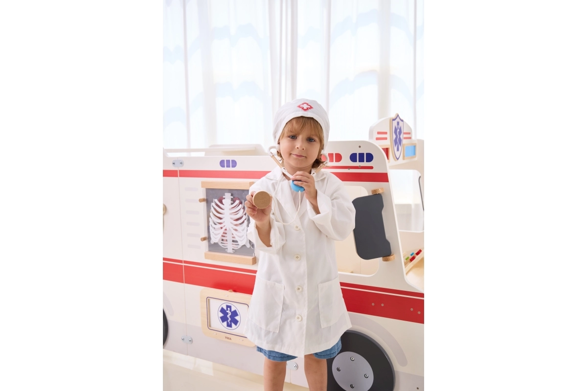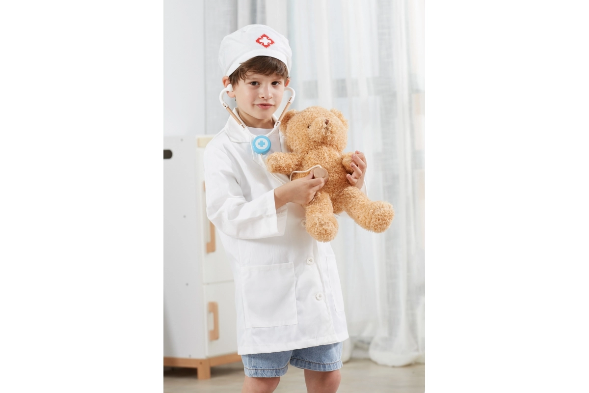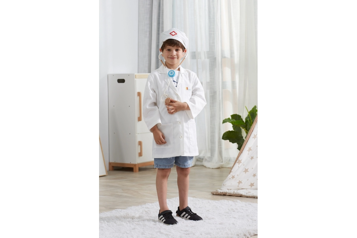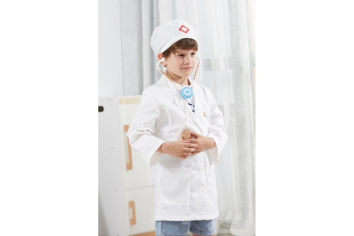 La bata blanca y el gorro con símbolo médico estimulan la imaginación infantil y aportan un toque realista al juego.