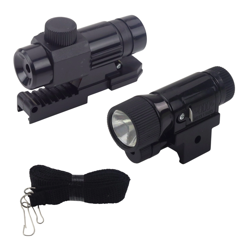 - rifle con efectos de luz y sonido, 2 acoples/accesorios frontales, correa para el hombro