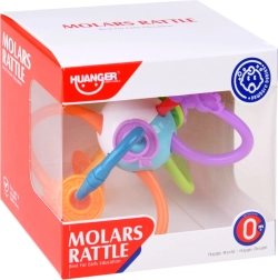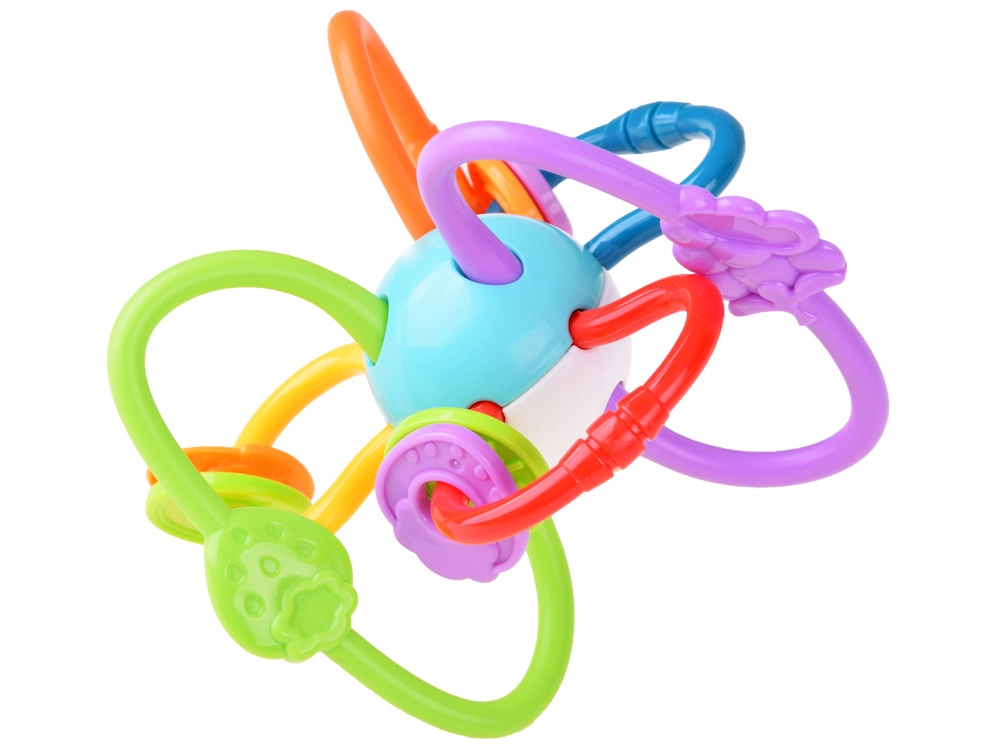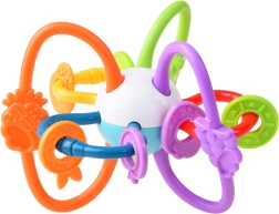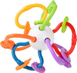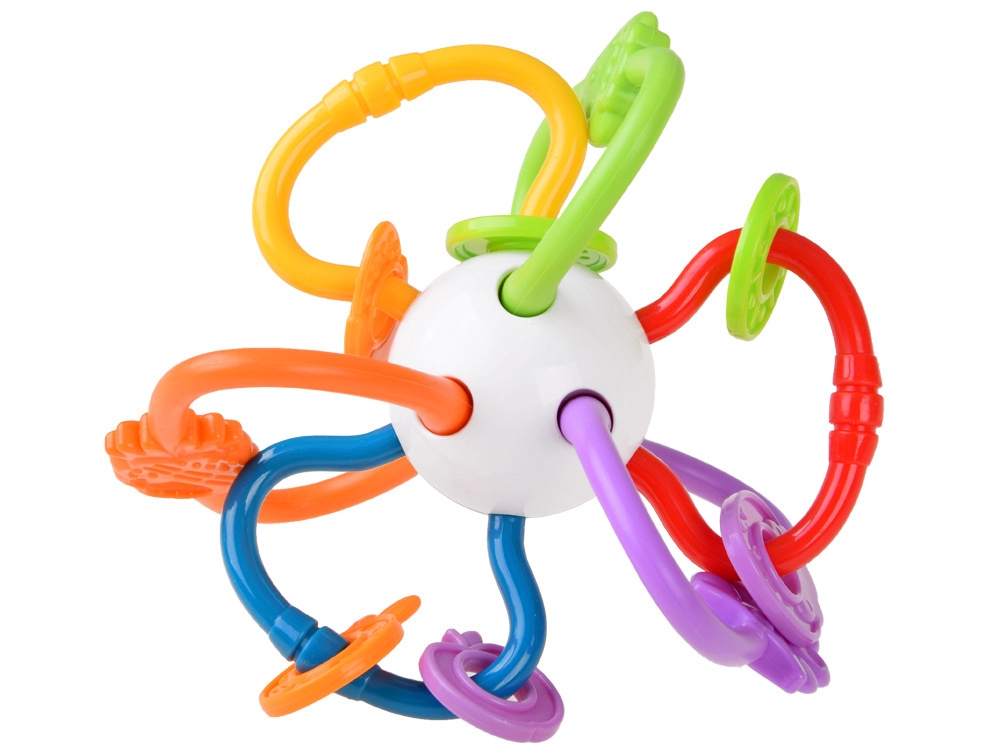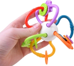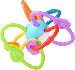 Este mordedor está fabricado con materiales de alta calidad y seguros, adecuados para bebés. Gracias a sus partes retorcidas y flexibles, se agarra con facilidad, masajea las encías y al mismo tiempo suena suavemente, lo que estimula la audición. Los elementos de colores que se deslizan con fluidez invitan a explorar y entrenan la motricidad fina.