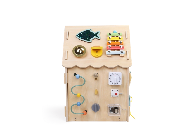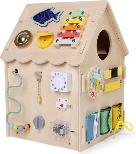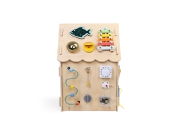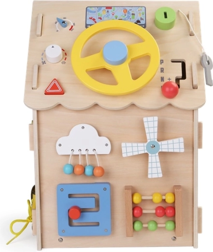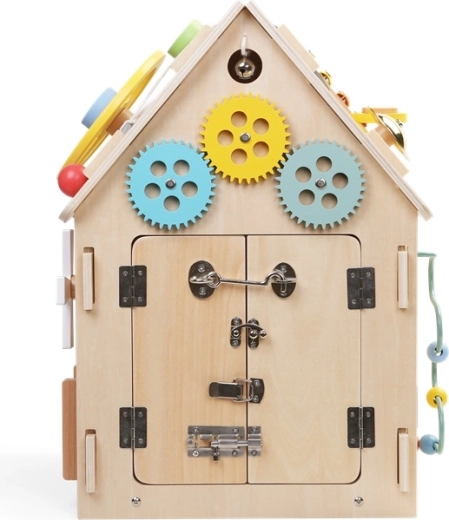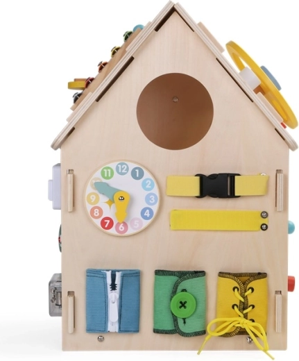La casita fomenta la concentración, la paciencia y habilidades cotidianas como cerrar cremalleras, abrochar botones, enlazar cordones o usar hebillas. Su robusta estructura de madera, los bordes lisos y las pinturas no tóxicas garantizan un uso seguro.
