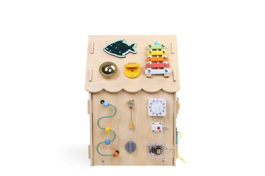 Descubrid el mundo de las habilidades con esta casita activa que atrapa a los niños en el juego durante horas. Cada lado esconde nuevos retos: girar el volante y la palanca de cambios, guiar la bolita por el laberinto, conectar engranajes de colores, probar cerraduras, pestillos y pasadores, o disfrutar de estímulos sonoros y táctiles gracias a las cuentas y al molinillo.
