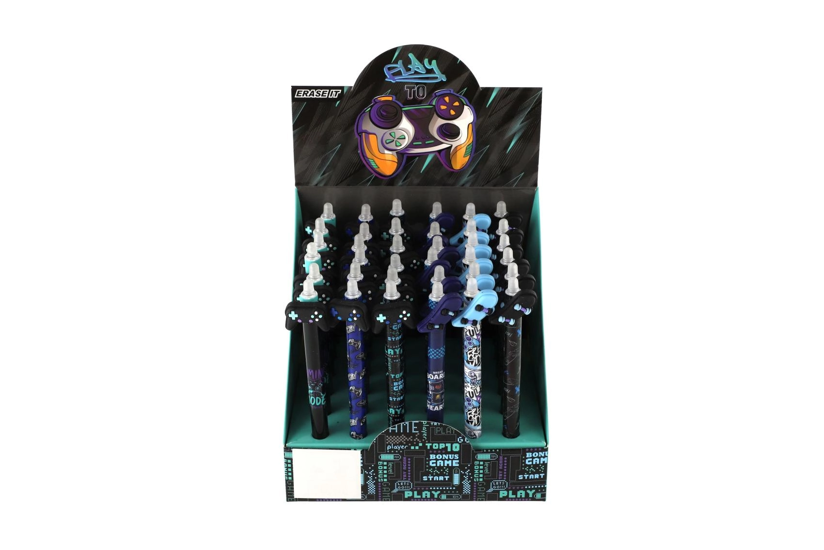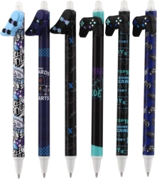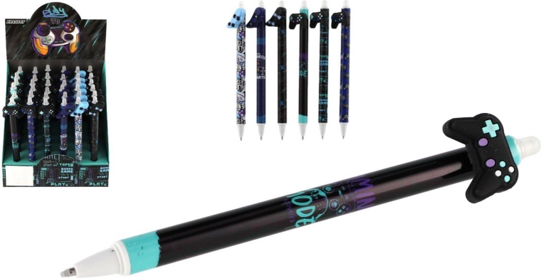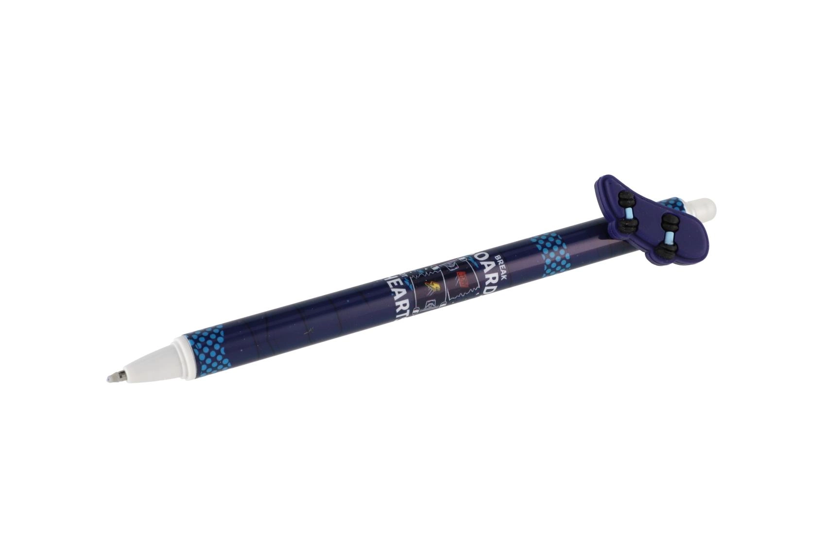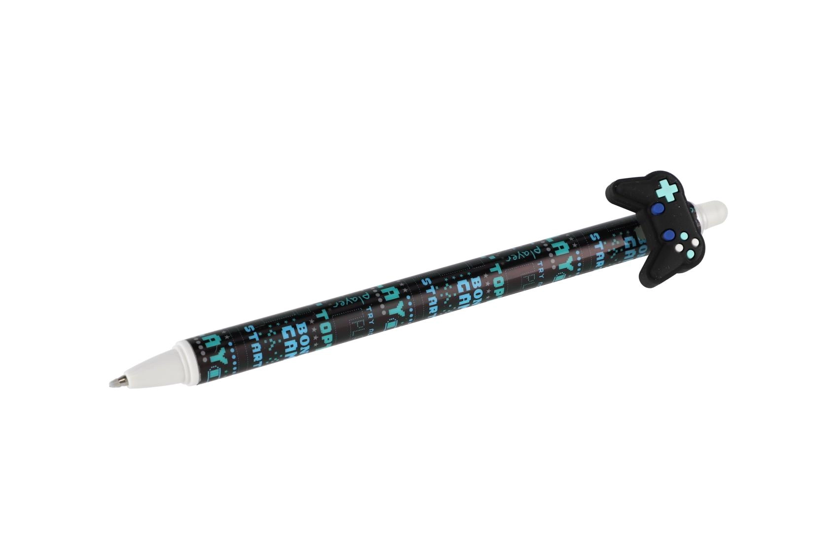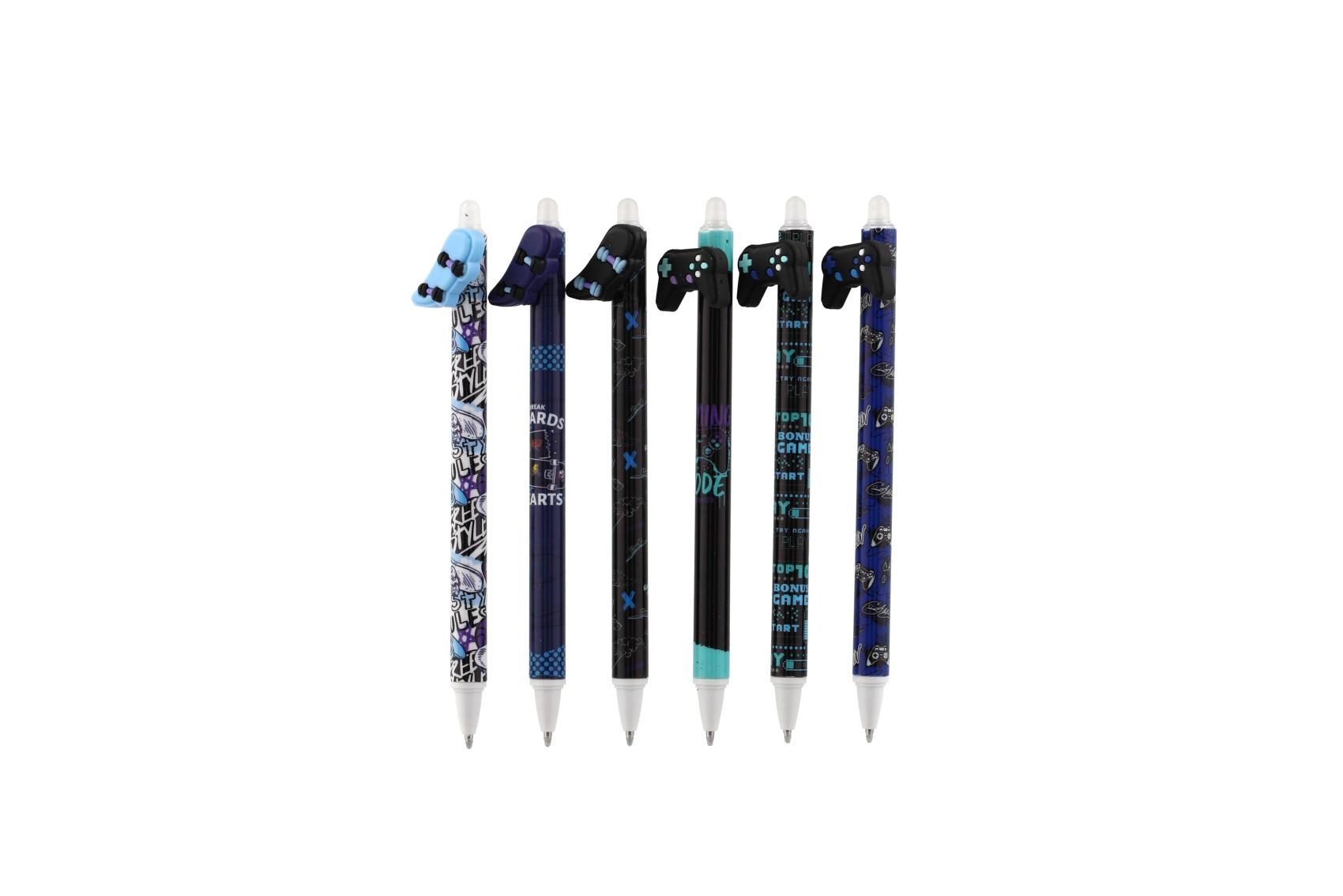 Cada bolígrafo incluye un topper original con forma de mando, monopatín, pajarita o alas, y está decorado con estampados modernos en una paleta negra y azul. Gracias a la tinta borrable podrás corregir fácilmente pequeños errores sin dejar marcas.