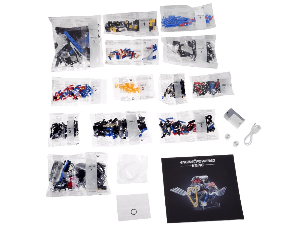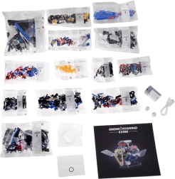 Incluye bolsas numeradas para facilitar la organización, un cable USB para la carga y un claro manual ilustrado. La llamativa luz roja aporta un aspecto impactante al modelo y resalta las partes móviles.