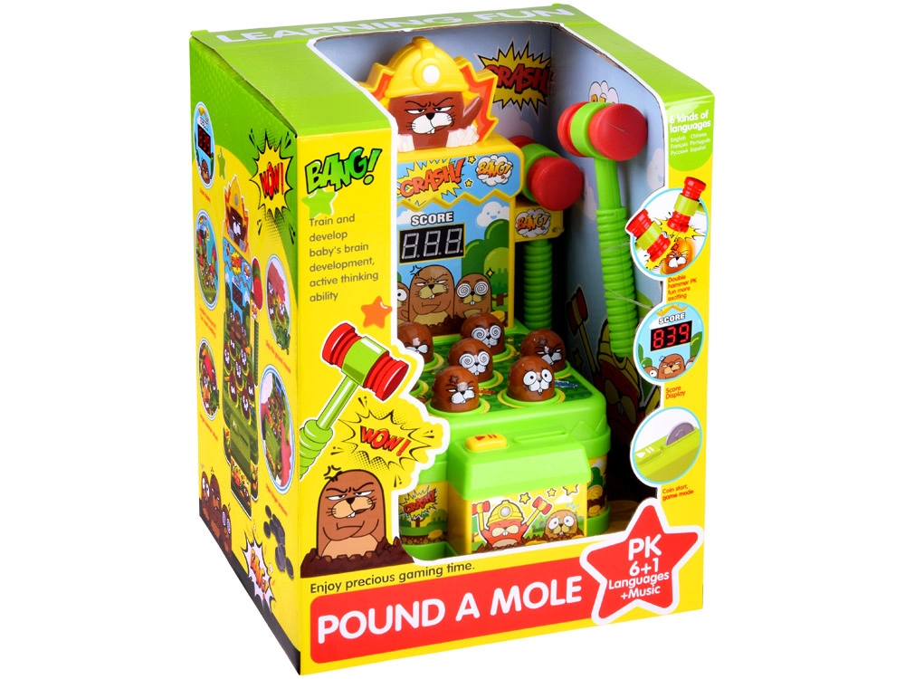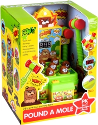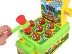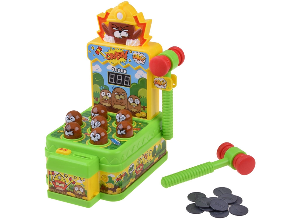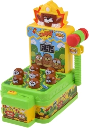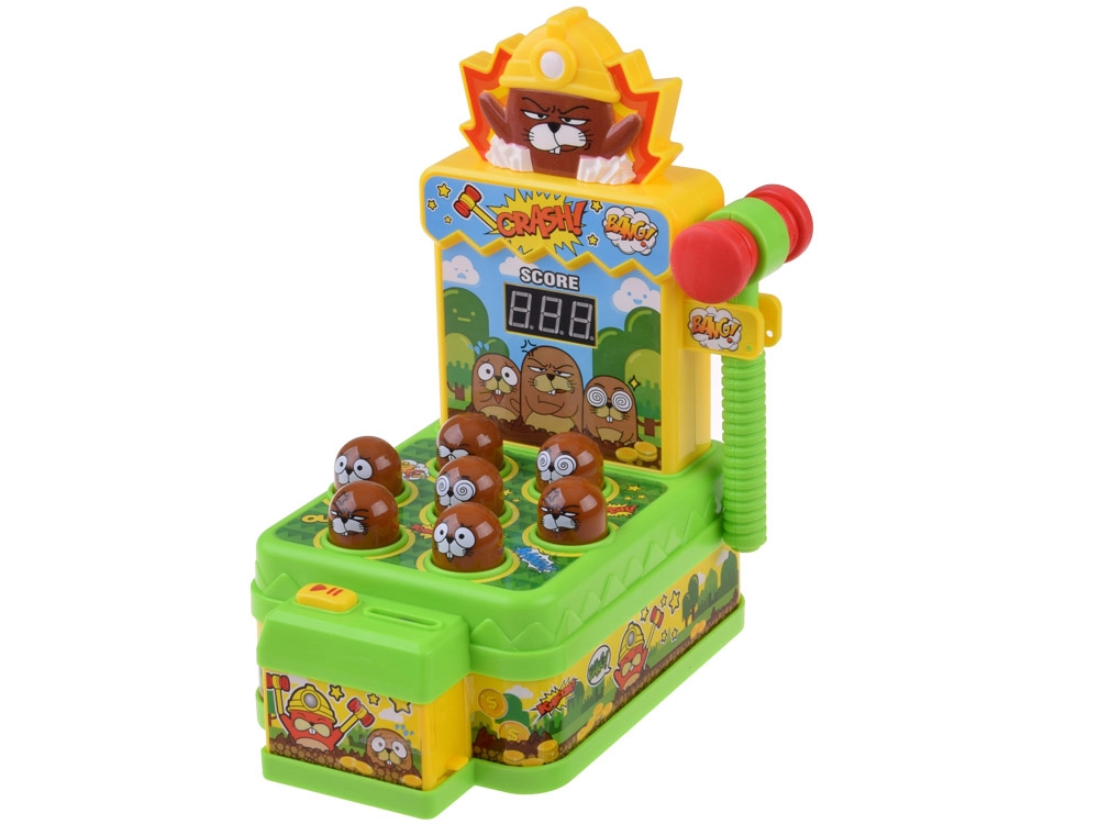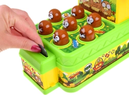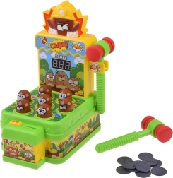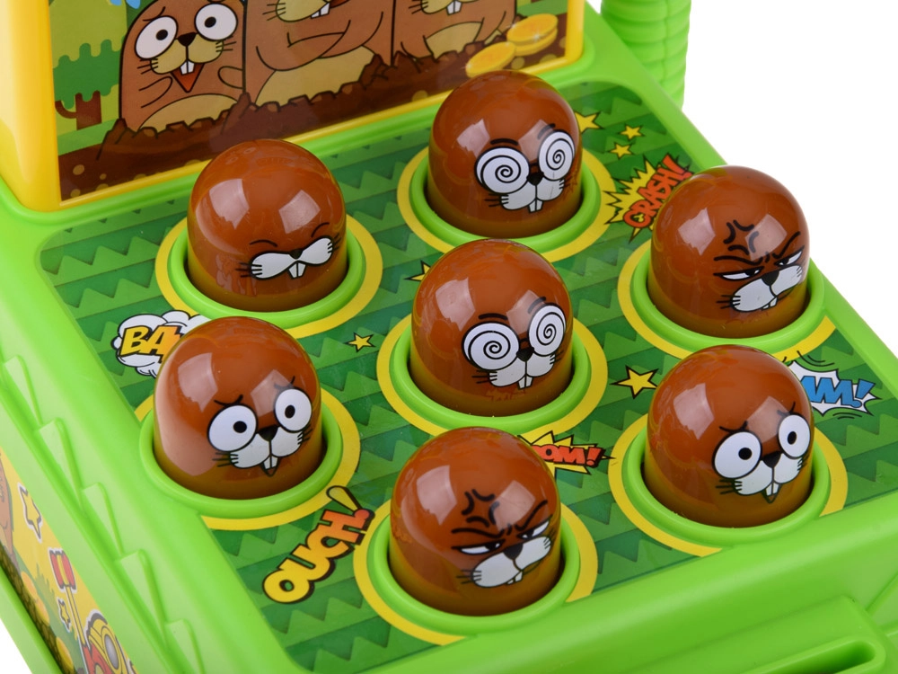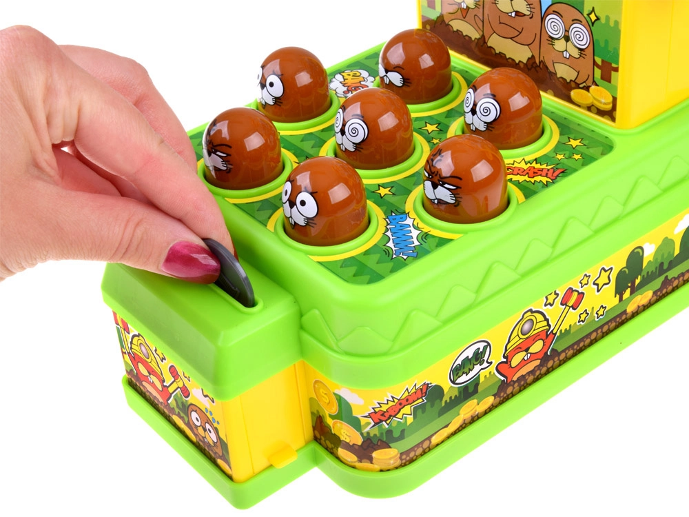Descubre una diversión familiar que engancha desde el primer golpe. En el tablero de juego se iluminan aleatoriamente 7 topos; tu tarea es golpear lo más rápido posible con el martillo de goma blando precisamente a los que estén iluminados. Cada acierto suma puntos, que ves en la pantalla clara. El juego desarrolla la motricidad fina, las habilidades de coordinación y la velocidad de reacción.
