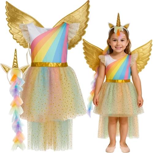 Adorable disfraz infantil de unicornio en talla 122–128 cm que convertirá a cualquier pequeña princesa en un ser mágico. Incluye falda con superposición de tul brillante, alas doradas y diadema con cuerno. El disfraz es ligero y cómodo de poner por la cabeza, ideal para carnaval, Halloween, fiestas y actuaciones escolares y se puede lavar a máquina a 30 °C. La certificación conforme a las normas europeas garantiza un uso seguro.