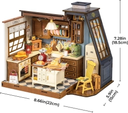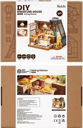Esta minicasa detalladamente elaborada aporta la atmósfera de una buena cocina de antaño. Encontrarás armarios de madera empotrados, una balanza antigua, una cafetera, encimeras blancas brillantes y una silla retro amarilla. Las grandes ventanas —una con acristalamiento inclinado de estilo europeo y otra con tejadillo y cortina— añaden luz y encanto a la escena. La iluminación LED subraya además el cálido toque de hogar.