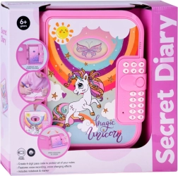El diario interactivo con unicornio es el lugar soñado para los pensamientos, dibujos y secretos de los niños. Tras introducir el código correcto, el diario se abre y revela un cuaderno rosa, un rotulador y una caja secreta para pequeños tesoros. El marco frontal se puede personalizar con una imagen intercambiable.