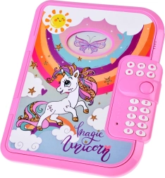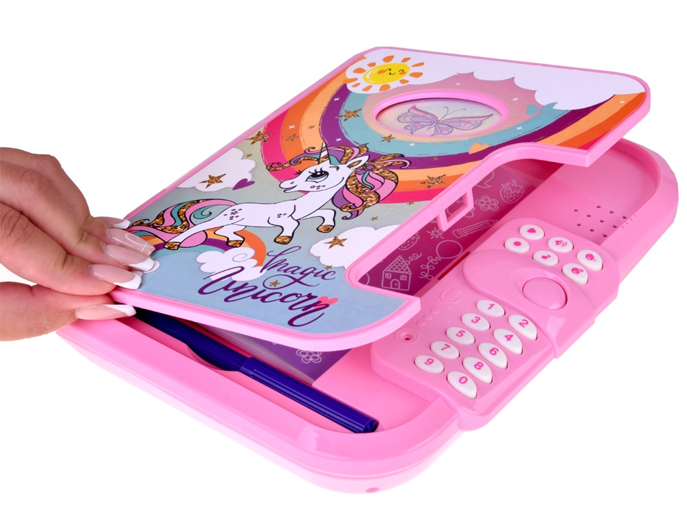 Descubre la magia de tus propios secretos con este diario interactivo con motivo de unicornio. Gracias al código de cuatro dígitos, todas las notas y pequeños objetos quedan seguramente protegidos. El diario ofrece 6 botones funcionales, grabación y reproducción de voz, cambiador de voz y 10 melodías integradas. Incluye un bloc rosa, un rotulador y un compartimento oculto para tesoros.
