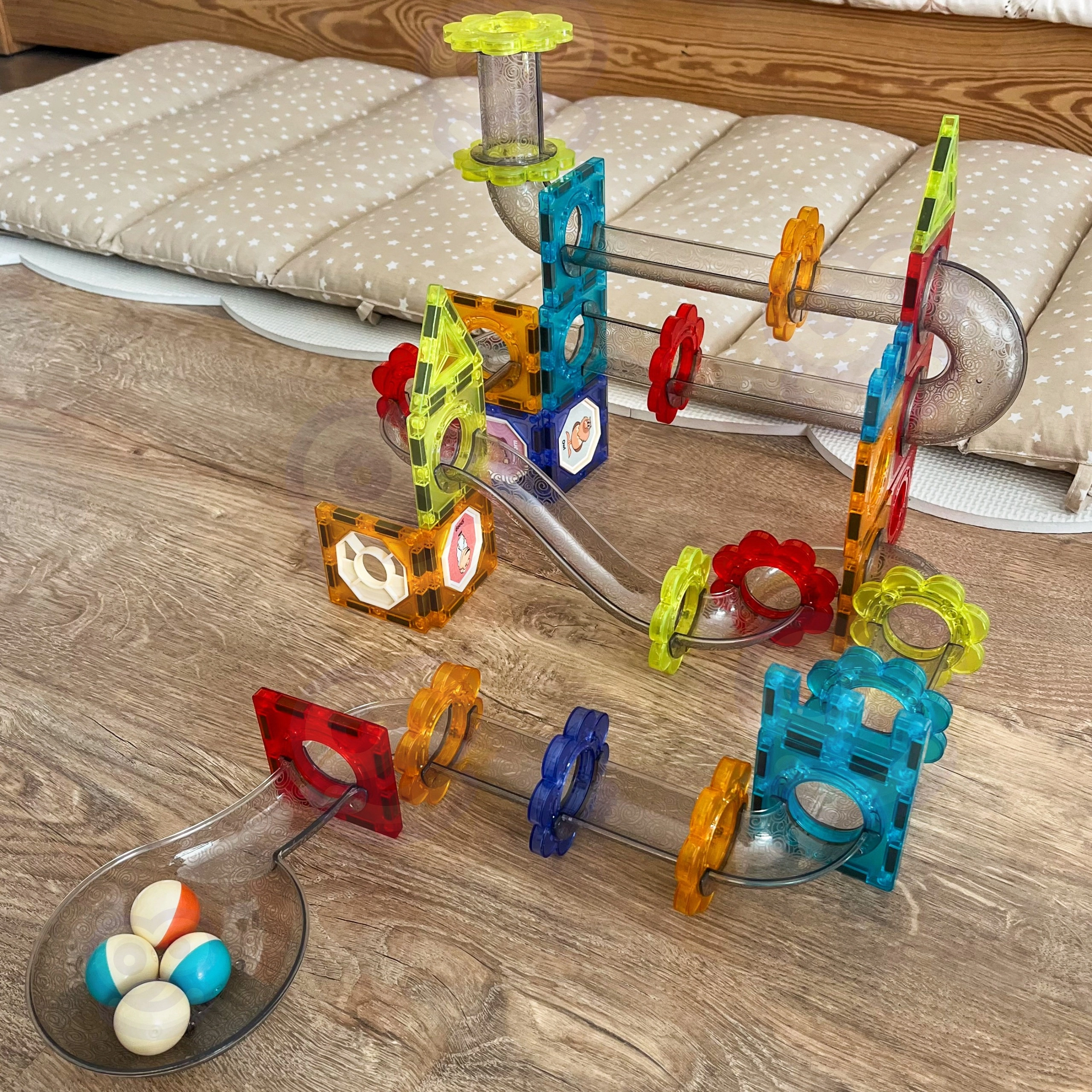 - Baldosas magnéticas de diversas formas y colores; elementos transparentes de la pista (canaletas, curvas, embudos, túneles); canicas de colores; pegatinas decorativas; manual ilustrado