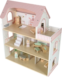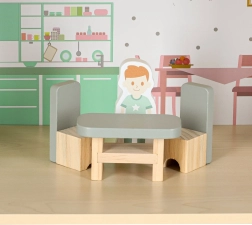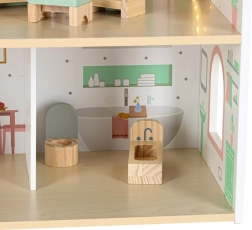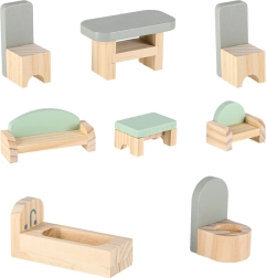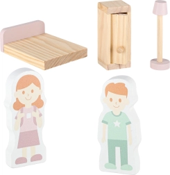 Incluye cama, armario, juego de sofá, mesa con sillas y equipamiento de baño. Dos figuritas de madera fomentan el juego de roles y la creatividad.