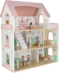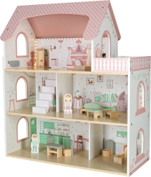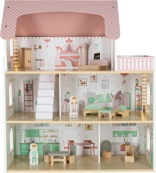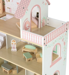 La estructura resistente de tableros MDF, los bordes suaves y el acabado estable garantizan un juego seguro. La casa mide 70 cm de altura, ideal para que los hermanos jueguen juntos. El armario abatible, los accesorios móviles y las dos figuritas de madera promueven historias imaginativas y el desarrollo de la motricidad fina.