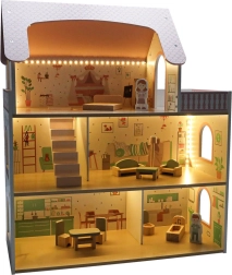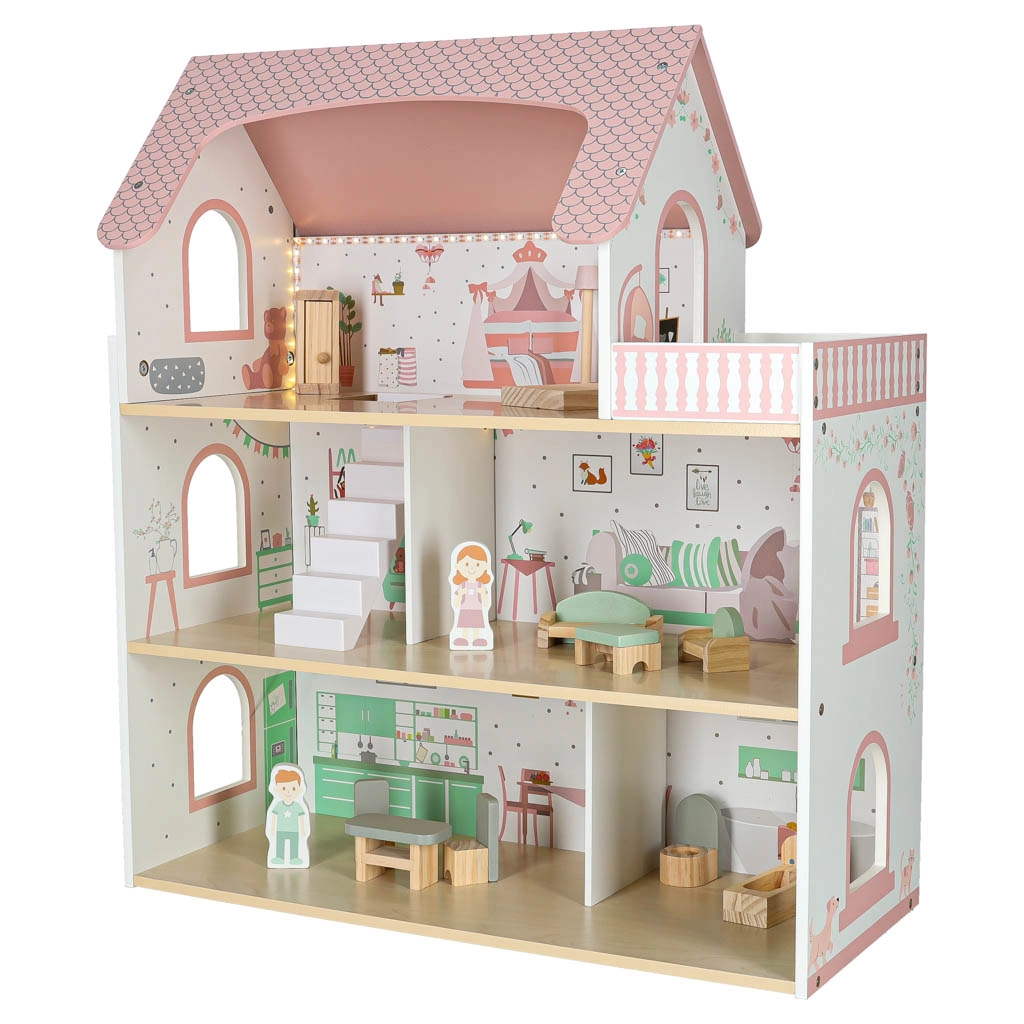 La casa de muñecas Lulilo Peonio es una hermosa vivienda de tres pisos en combinación rosa y menta, con impresión de interiores, escalera y balcón. Las lucecitas LED cálidas aportan una atmósfera mágica al juego nocturno y hacen más acogedora cada habitación. Gracias al completo conjunto de muebles, los niños pueden amueblar fácilmente el dormitorio, sala de estar, cocina y baño.