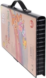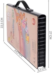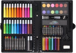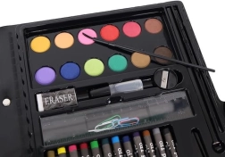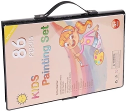 El juego de pintura incluye 86 piezas que ofrecen una amplia selección para dibujar y pintar: 12 lápices de colores, 24 rotuladores gruesos, 12 pasteles al óleo, 12 ceras, 12 acuarelas, una esponja, una goma de borrar, un pincel, unas tijeras, un lápiz, un sacapuntas, pegamento, una regla, una paleta de pintor y 5 clips de colores.