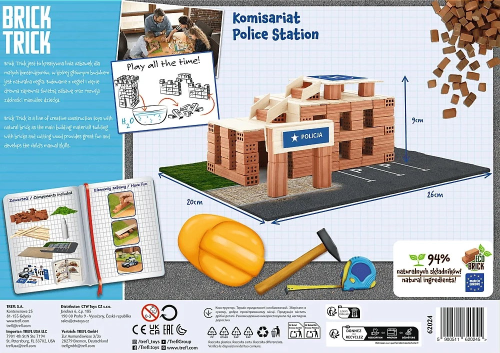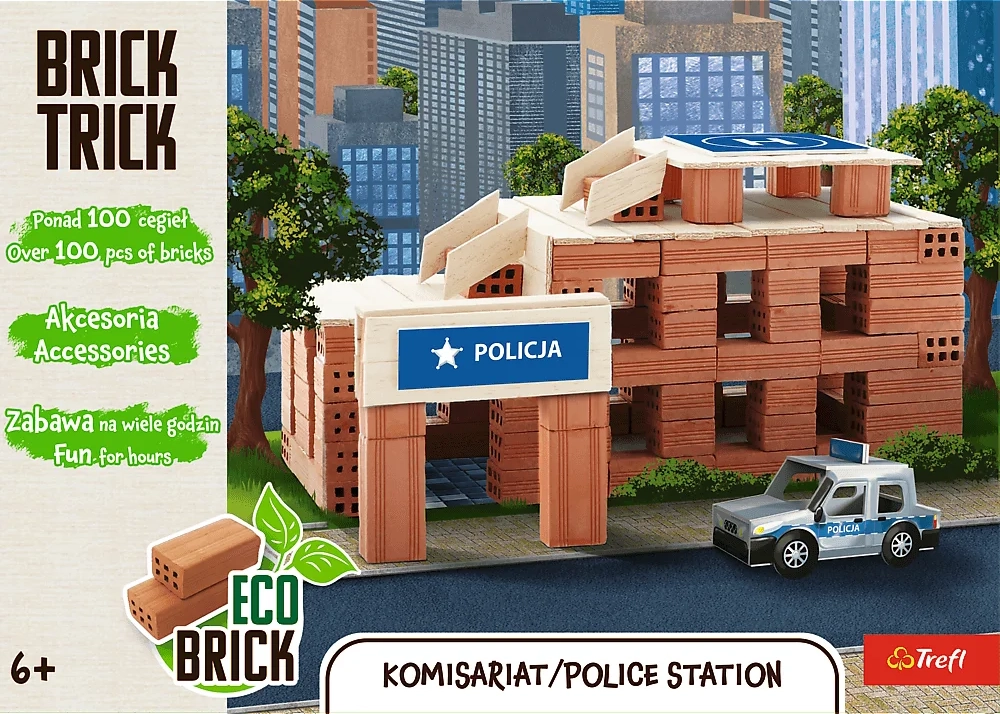 Descubre el set de construcción creativo Trefl Brick Trick Estación de Policía con 100 ladrillos de arcilla reales y decoraciones. Niños y adultos disfrutarán de una construcción realista paso a paso, desde la base, pasando por tablillas de madera, hasta la decoración final. El set desarrolla la destreza, la imaginación y la concentración y se puede usar repetidamente gracias al pegamento soluble en agua.