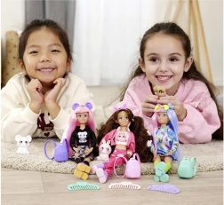 La muñeca Kawaii Hi Mia brinda mucha diversión gracias a su cabello extra largo, que se puede peinar, adornar y estilizar con accesorios de colores. Incluye el tierno perrito Choco, que complementa las historias y fomenta la imaginación durante el juego.