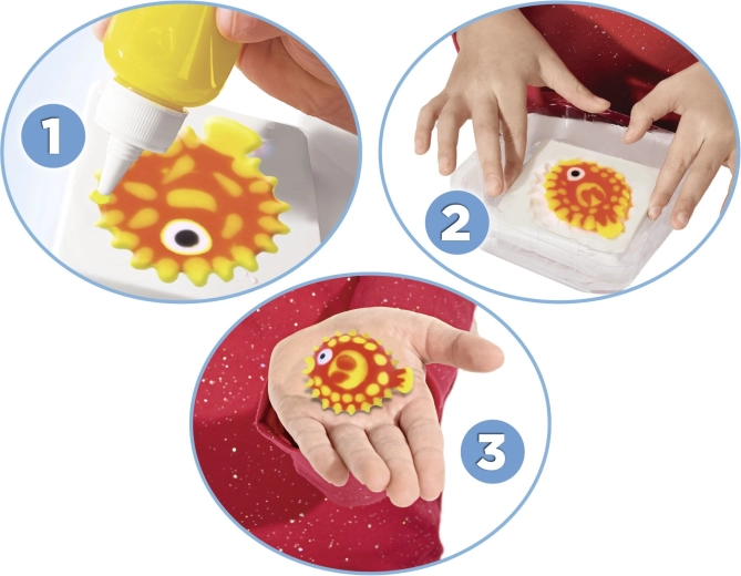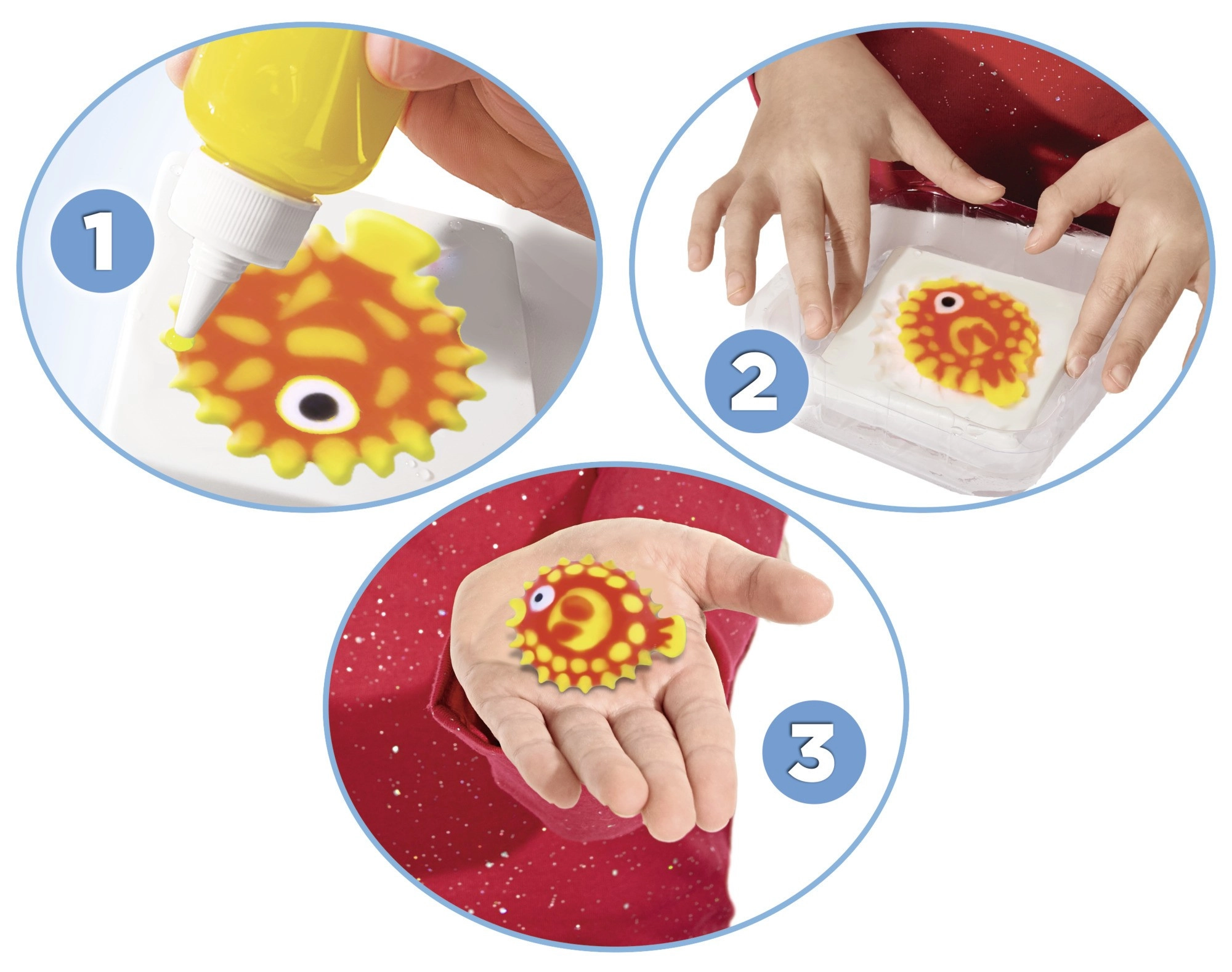 Mezcla la solución, rellena el molde con gel y sumérgelo en agua: en un instante se forma una suave figura 3D lista para jugar.