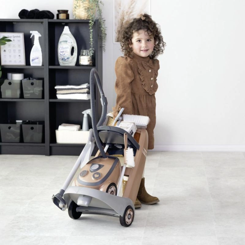 El set incluye abundantes accesorios: recogedor y cepillo de mano, fregona, cepillo, cubo y réplicas de productos de limpieza. Todo tiene su lugar en el práctico carrito con asa y organizadores, de modo que los niños aprenden orden y responsabilidad jugando.