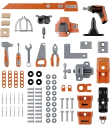 Incluye un set de construcción de coche que los pequeños mecánicos montan fácilmente en pocos pasos. El taller contiene martillo, llave para ruedas, destornillador, llave plana/abierta, alicates, sierra, gran abrazadera y calibre deslizante, además de tornillos, tuercas, clavos y material de fijación. Compatible y ampliable con todas las herramientas BLACK+DECKER de la marca Smoby.