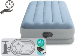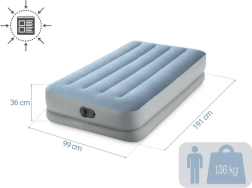 Cama inflable práctica y cómoda para un adulto con dimensiones de 191 × 99 × 36 cm. Gracias a las tecnologías Fiber-Tech y Dura-Beam ofrece soporte estable, superficie de terciopelo suave y larga durabilidad. La bomba eléctrica USB integrada garantiza un inflado rápido en cualquier lugar: desde una powerbank, cargador o puerto USB. Carga máxima 136 kg, incluye bolsa de transporte y parche de reparación.