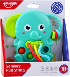 - Sonajero sensorial elefante, cuentas y anillas móviles, cordones de colores para tirar