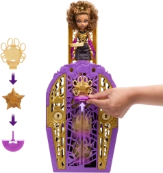 ¡Sigue las pistas de Clawdeen Wolf al mundo de Hollyduch! Con la llave con lupa revela los símbolos en el mapa, abre el armario decorativo y descubre accesorios temáticos con símbolos a juego. Ensambla las tres piezas en un talismán, fíjalo en la base del armario y deslízalo hacia arriba: revelarás a la muñeca Clawdeen con un look deslumbrante. Puedes repetir este momento mágico una y otra vez.