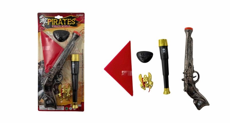 - Pistola pirata, catalejo, pañuelo, insignia pirata, parche para el ojo