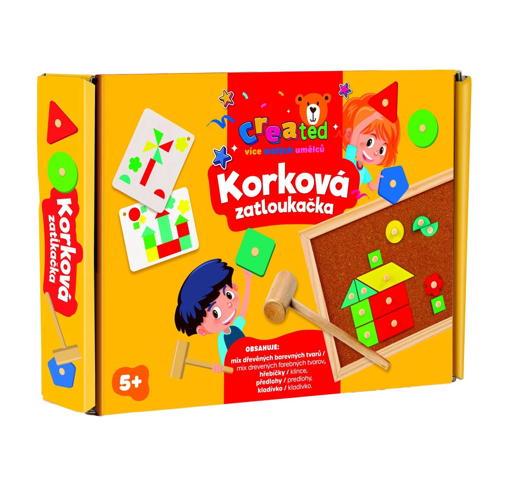 - Todo en uno: figuras de madera, martillo, clavitos y tabla de corcho.