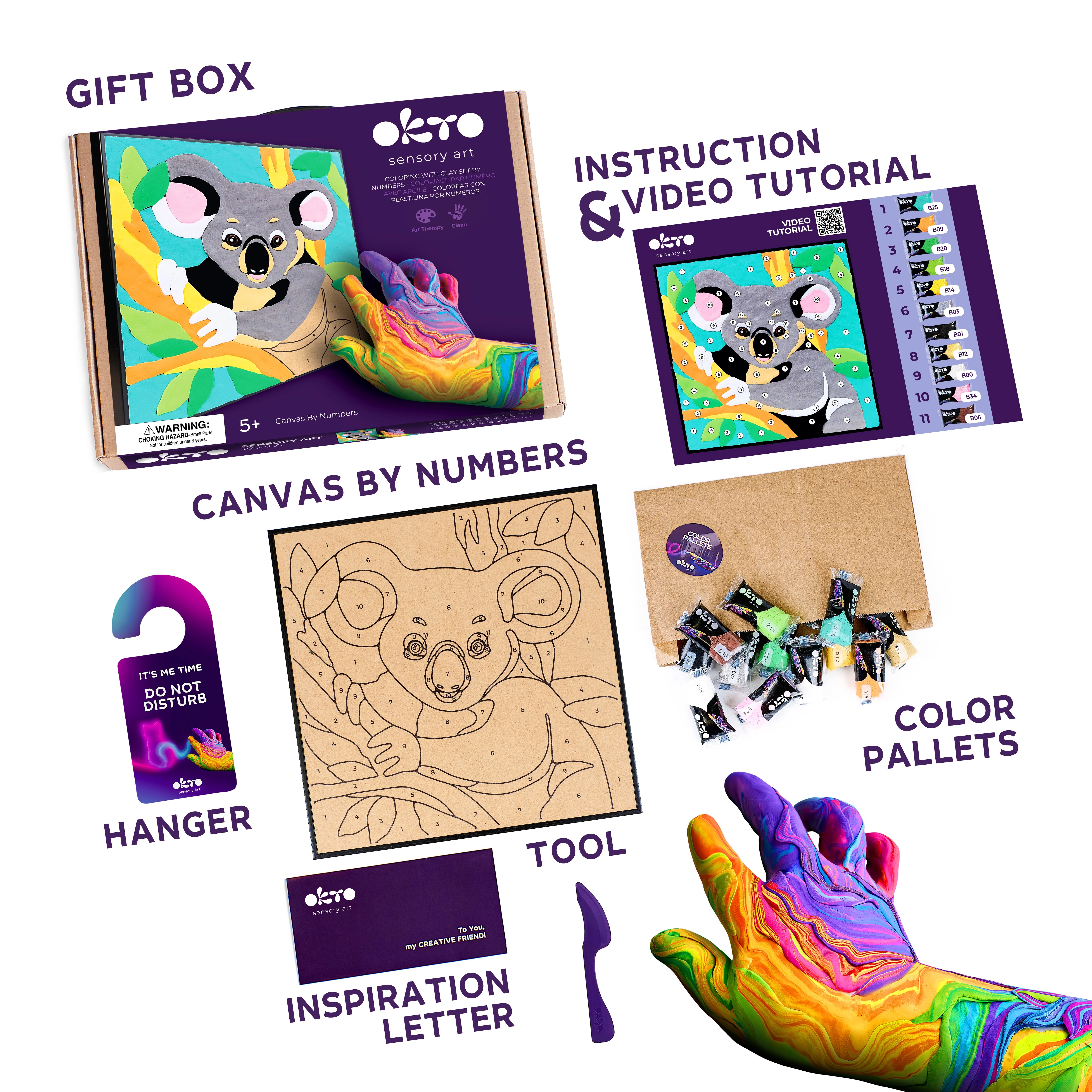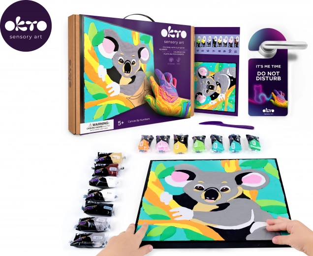 Cree una imagen 3D única con el motivo de una koala. El set OKTO está diseñado para que el trabajo sea intuitivo y divertido: solo hay que seguir los números y aplicar la masa de color con la herramienta de modelado incluida. El resultado es volumétrico y decorativo, adecuado para exhibir en la habitación infantil o como un bonito regalo.