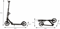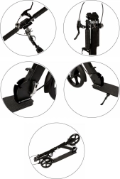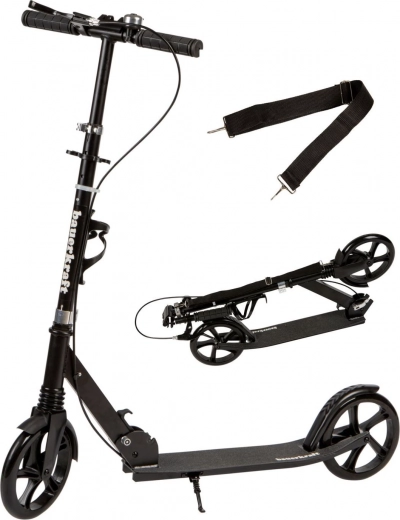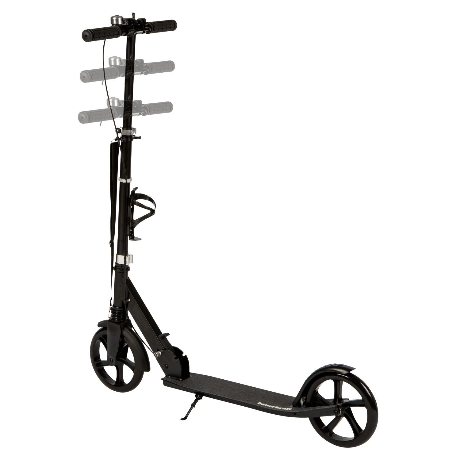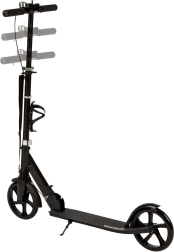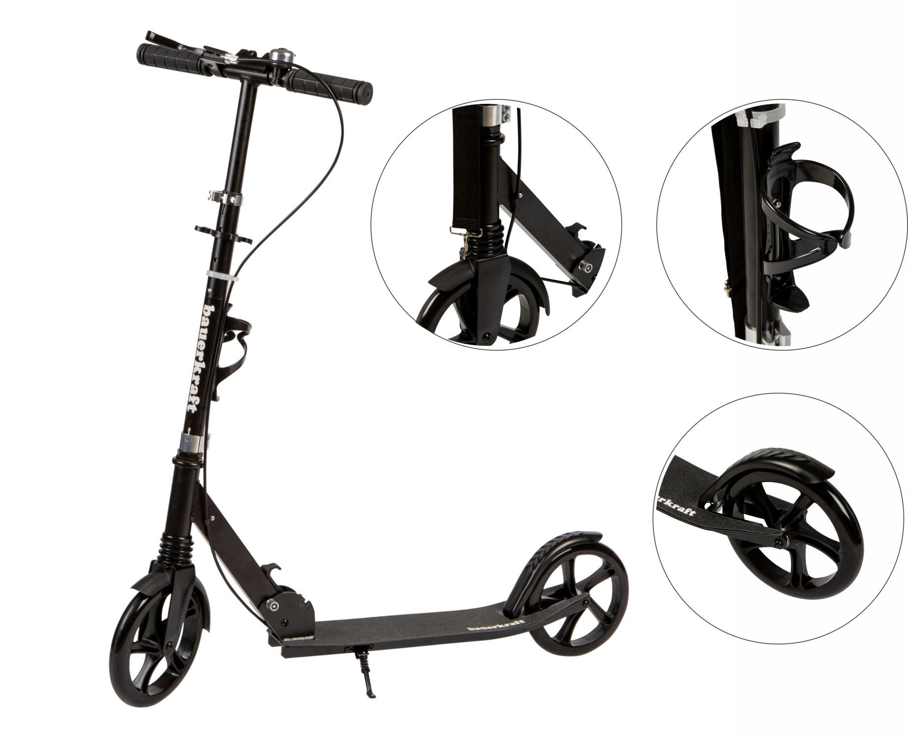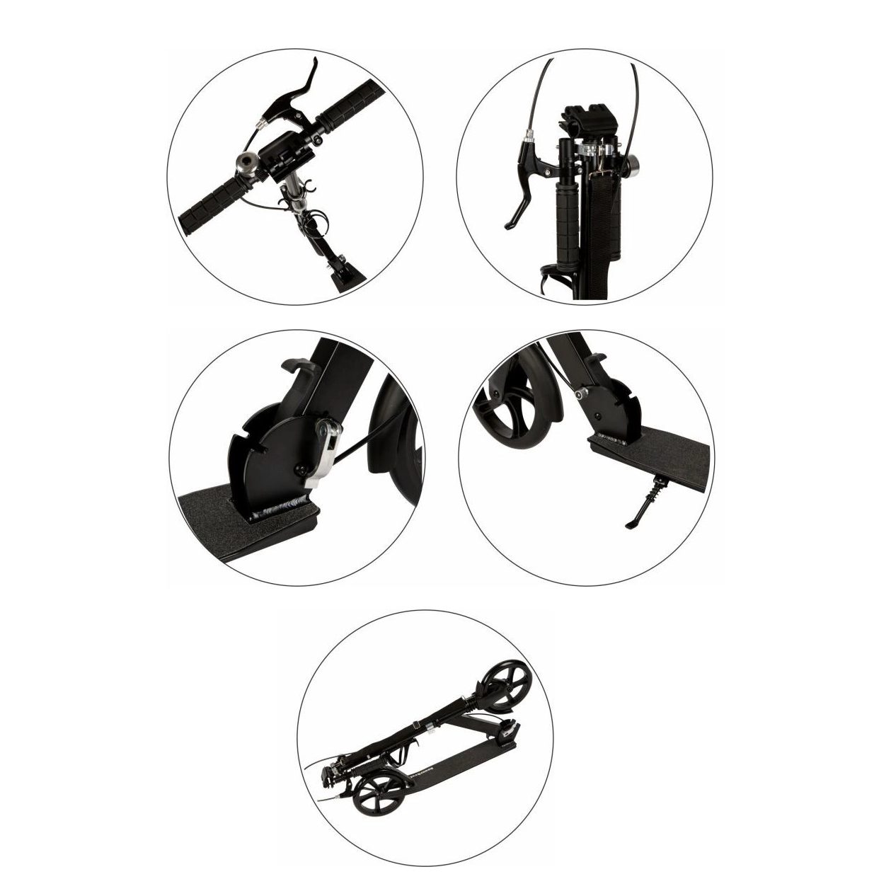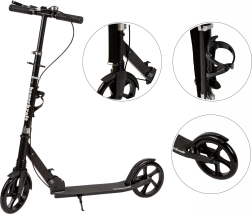 Patinete urbano ligero de aluminio para niños y adolescentes con ruedas grandes de 200 mm con rodamientos ABEC-7, manillar ajustable 95–105 cm, suspensión delantera y chasis plegable. Para una conducción segura incluye freno de mano y freno de pie, tabla antideslizante, pata de apoyo, timbre y práctico portabotellas. Carga máxima 80 kg.