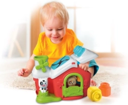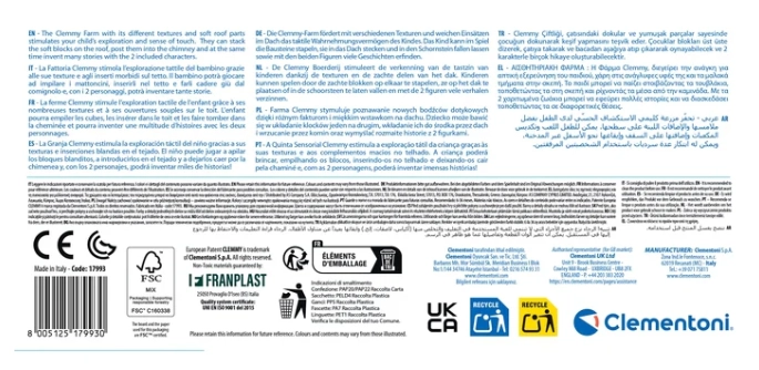 Esta granja interactiva de la línea Clemmy ofrece un juego seguro y estimulante para los más pequeños. En su interior encontrarás muchos bloques blandos y fáciles de agarrar que pueden insertarse por las ventanas y también por el techo. Una parte del techo tiene una inserción blanda para encajar, y la otra se abre para extraer los bloques fácilmente.