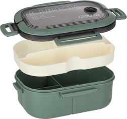 Práctica caja de almuerzo de 1200 ml con tres compartimentos y tapa hermética con 4 clips que mantiene el almuerzo fresco y separado. Incluye bandeja extraíble, tenedor y cuchara. Apta para lavavajillas y microondas (sin tapa), fabricada en plástico libre de BPA.