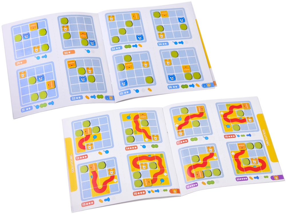 La dificultad progresiva en cuatro niveles enseña a los niños a planificar rutas, pensar por adelantado y resolver problemas paso a paso. Cada reto tiene una única solución correcta.