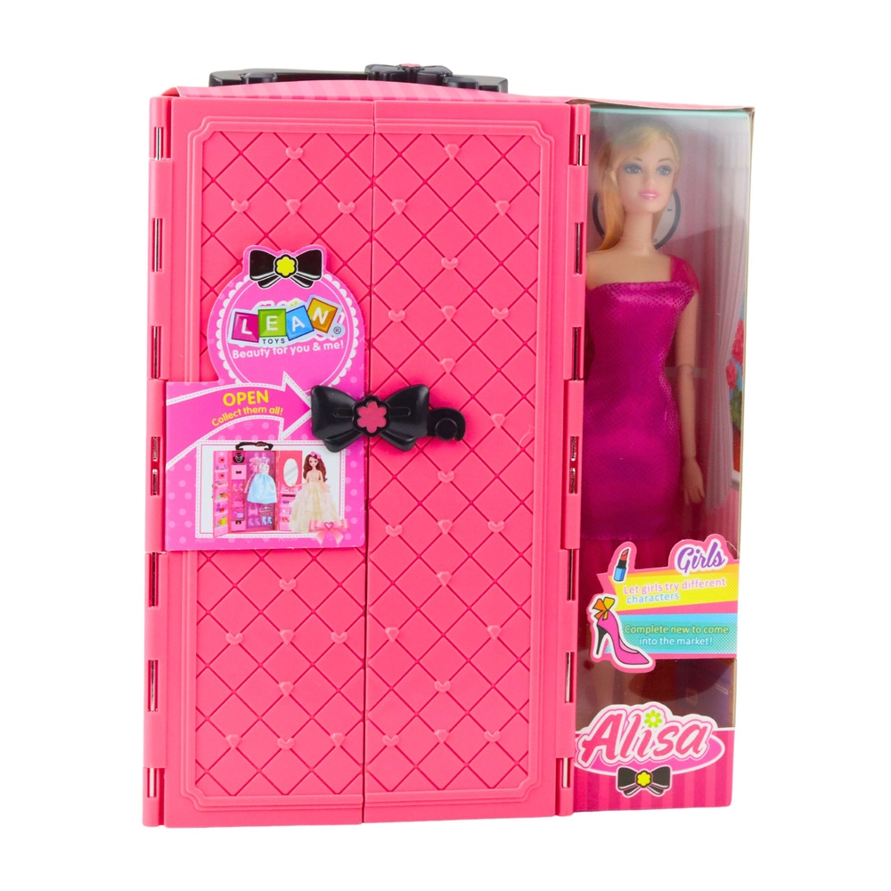 - muñeca 30 cm; armario rosa; 2 vestidos; perchas; zapatos; bolsos; espejo; embalaje original