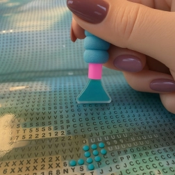 La bandeja estriada, el aplicador y la cera garantizan una recogida y colocación precisas de las piedritas en los lugares correctos según los símbolos del lienzo.