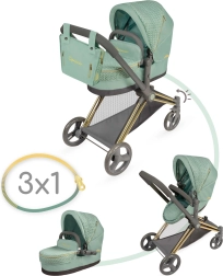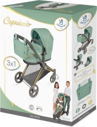 Elegante cochecito infantil para muñecas 3 en 1 de la colección CAPRICCIO en moderno color verde menta, ofrece capazo profundo, asiento deportivo y capazo portátil. Cuenta con capota ajustable, ruedas delanteras giratorias para un fácil manejo, cesta de almacenamiento y bolso desmontable con cremalleras doradas. Gracias a su estructura plegable no ocupa espacio y es ideal para niños a partir de 3 años.